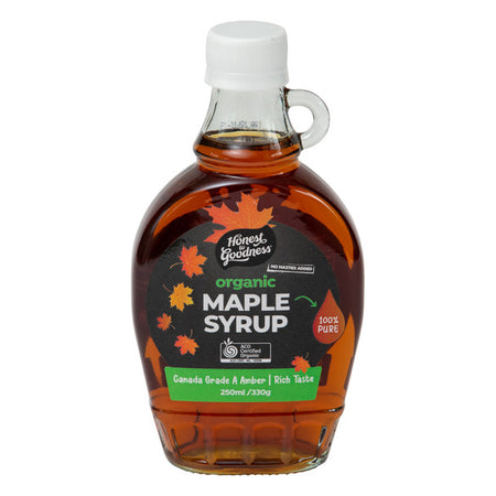 Honest to Goodness Organic Maple Syrup is amber in colour and has a delightful, rich maple flavour. Unlike maple flavoured syrups which can contain additives such as corn syrup, glucose, artificial flavouring, preservatives or other additives